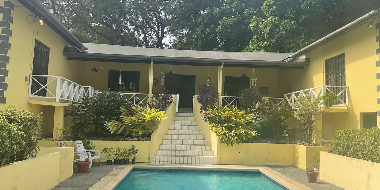 36’x11’10” - the covered porch overlooks the pool, garden and leafy vegetation. There is a dining table and chairs made from Courbaril, a Guyanese hardwood as well as chairs and love seats